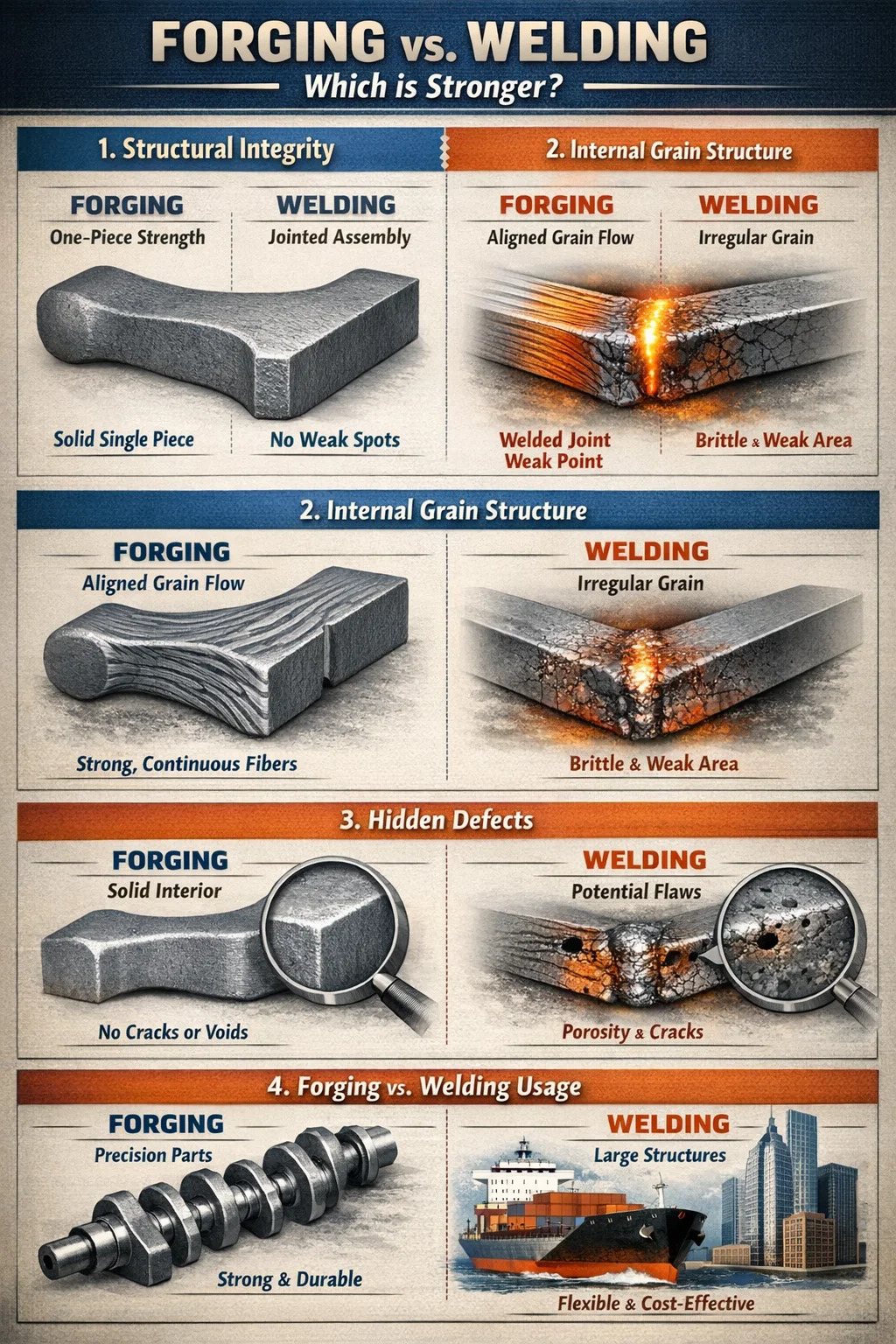 Costo: la saldatura è adatta per strutture grandi e complesse, mentre la forgiatura è più adatta per componenti precisi e resistenti.