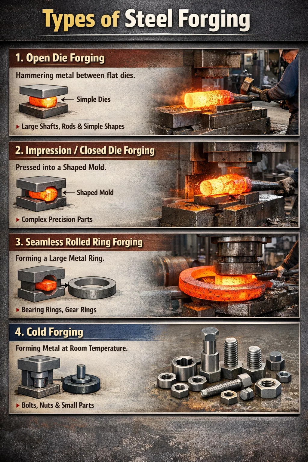 Nel campo della lavorazione dei metalli esistono molti processi di forgiatura diversi. Secondo il metodo di classificazione più comune, forgiatura dell'acciaio solitamente possono essere suddivisi nelle seguenti quattro categorie: