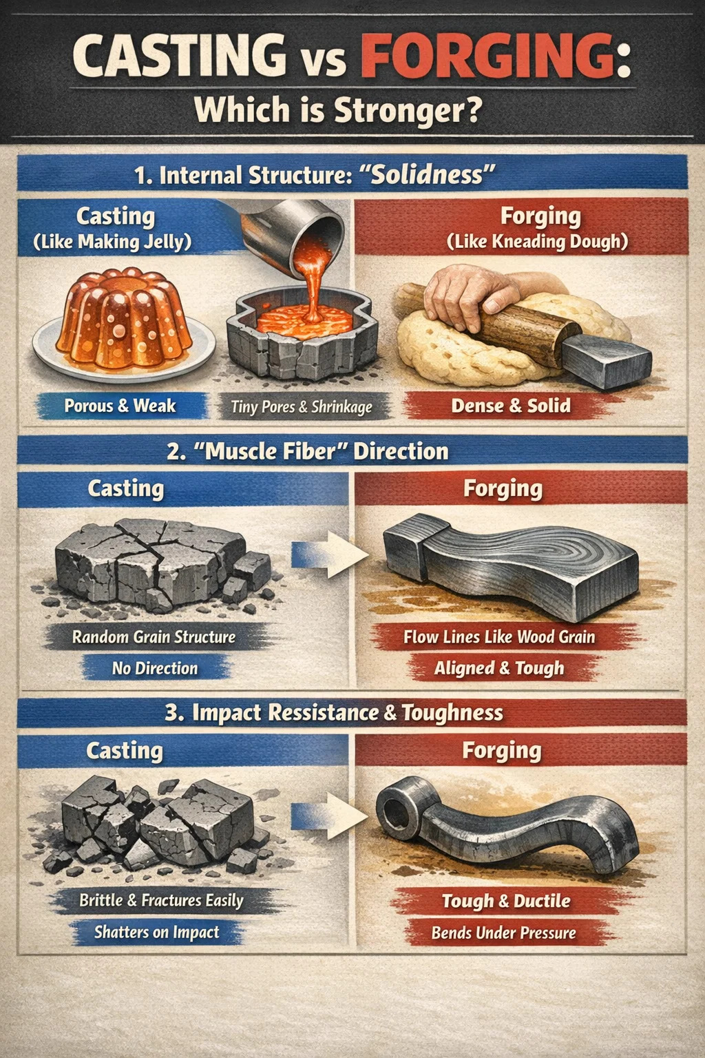 Se confrontiamo il metallo con gli ingredienti alimentari, la fusione è come "fare la gelatina". forgiatura dell'acciaio è come "impastare la pasta". Sebbene entrambi possano creare la forma desiderata, la densità interna e la resistenza agli urti sono completamente diverse.